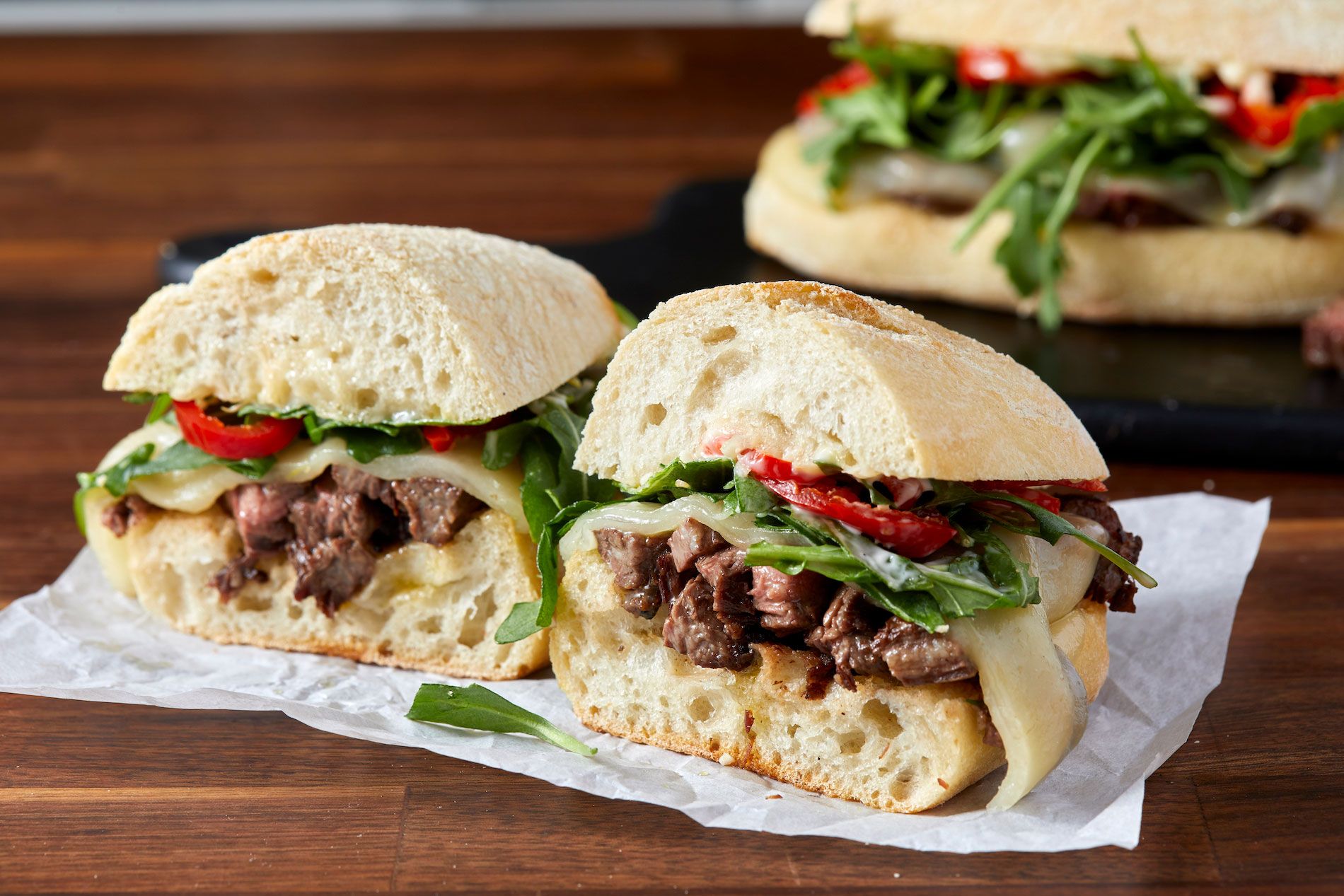 For a little something different, this steak sandwich is so satisfying and easy to make. It combines thin skirt steak, melted provolone, red peppers, arugula, and garlic aioli for the perfect hearty sandwich. Serve on ciabatta bread and enjoy for lunch or dinner!